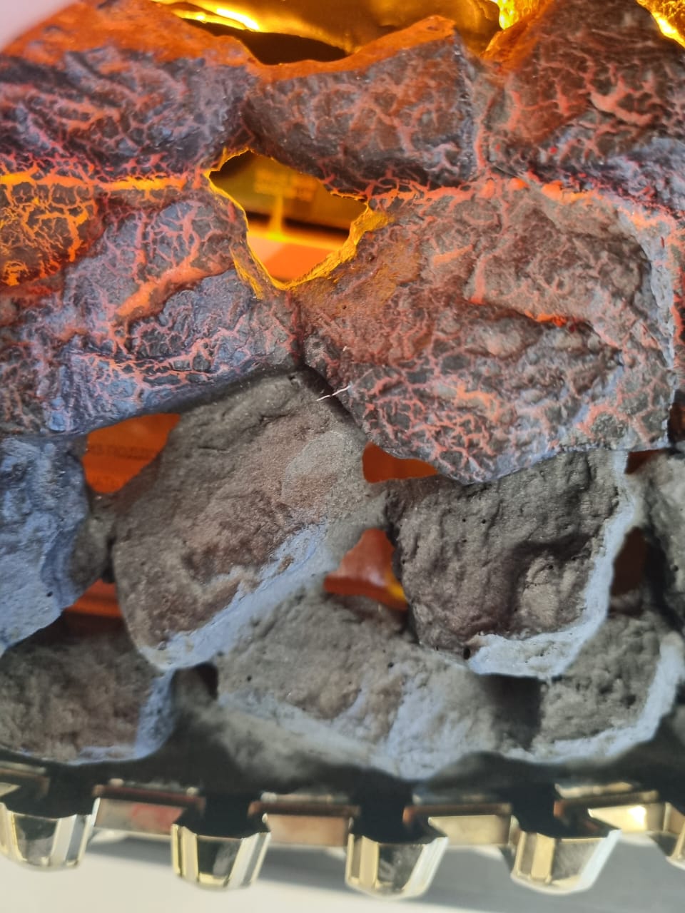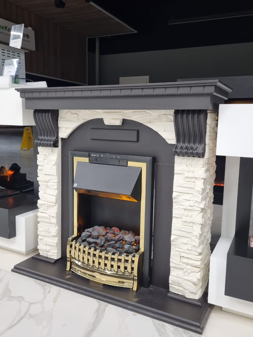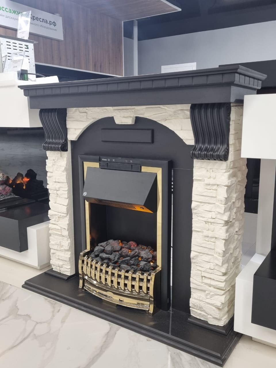 Вместо классических поленьев в очаге используется имитация тлеющих углей.