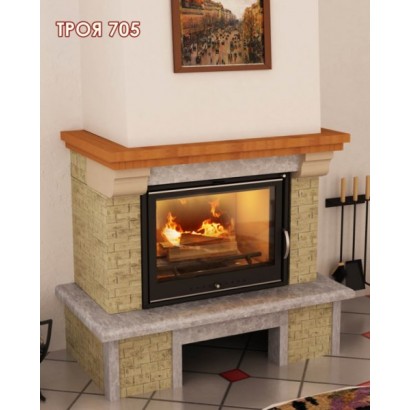 Компактная пристенная каминная облицовка Мета ТРОЯ 705 изготовлена из колотого доломита желтого цвета, натурального мрамора (бежево-серого цвета) с обработкой Антик и камня META Stone™ серо-белого цвета.