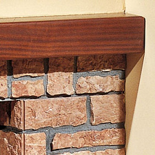 Угловая каминная облицовка из полированного бежевого мрамора с деревянной балкой.